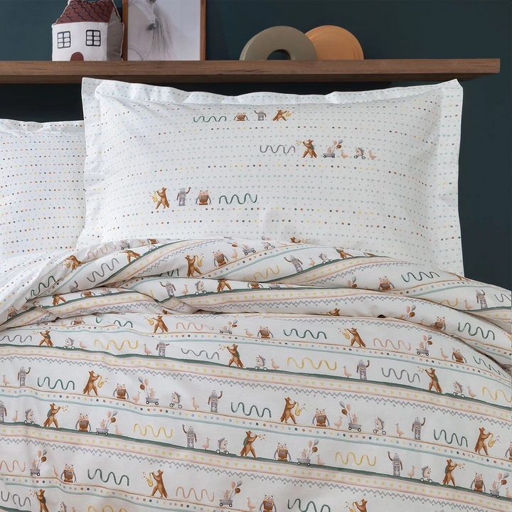 Dětské povlečení Nutta je speciálně navrženo pro děti a miminka. Spojuje tóny modré a bílé s pestrými vzory, čímž vytváří barevný a kouzelný vzhled. Prodyšná struktura látky pomáhá během spánku regulovat tělesnou teplotu a předchází přerušení spánku způsobenému pocením. Díky kvalitní 100% bavlně poskytuje měkké a pohodlné prostředí pro spánek.
