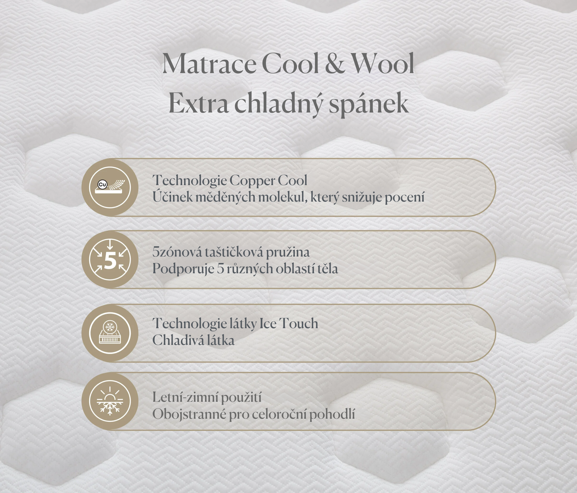 Páteři přátelská matrace Cool&Wool se díky 5zónovému taštičkovému pružinovému systému dokonale přizpůsobí různým typům těla a poskytne správnou oporu těm, kteří trpí bolestmi v oblasti bederní páteře, krku a zad. 5zónový taštičkový pružinový systém s nezávisle fungujícími pružinami různých tuhostí se přizpůsobí tělesné stavbě párů sdílejících stejnou postel bez ohledu na jejich hmotnost a zároveň pomáhá zmírnit bolesti kloubů.